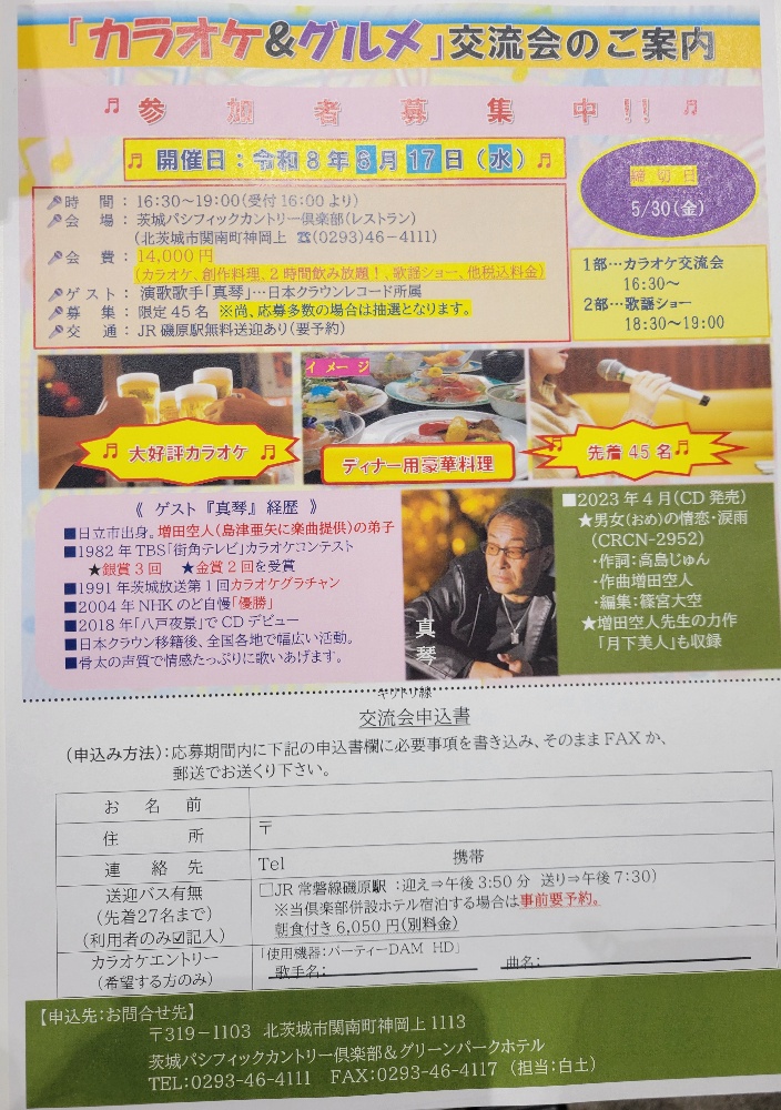 6月17日(水) 茨城パシフィックカントリー倶楽部にて、カラオケ&グルメ交流会を開催します。